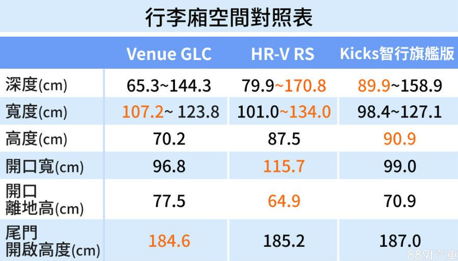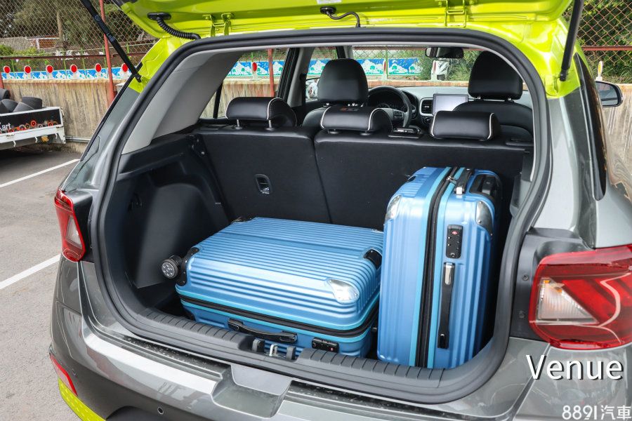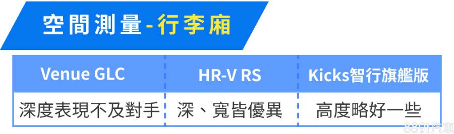 實際放入20吋、26吋行李箱,Venue因為深度不足導致無法縱向擺放,但透過底板下移14cm,稍加堆疊還是能夠滿足全車乘客的行李需求。HR-V與Kicks則表現出色,放入兩組行李箱後都還有很大空間供利用,且深度、高度都相當充裕。