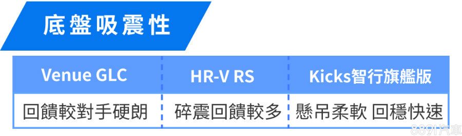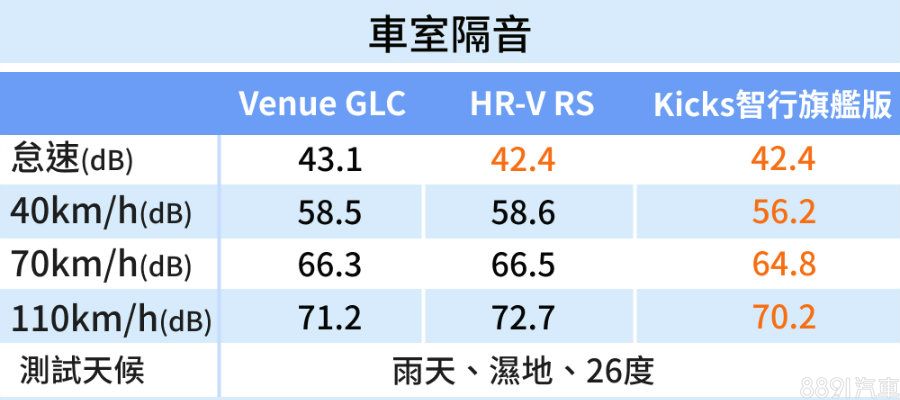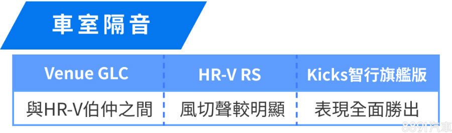 Venue與HR-V隔音表現相近,除怠速HR-V勝出之外,其他車速實測都在伯仲之間,Venue主要是風切聲稍嫌明顯,HR-V則是底盤噪音略大,兩者在隔音方面都不算出色。至於Kicks則顯然安靜些,在任何車速實測都比同場對手安靜。