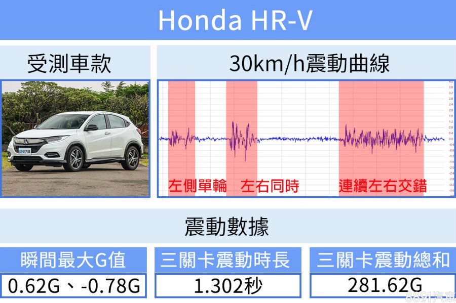 HR-V在60km/h關卡的震動總和為三車最高,但實測過程的結果反應來看,和Venue設定略為偏硬的狀況有些不同,HR-V比較像是因為稍多的車體晃動,而讓成績受到影響,不論是體感或儀器實測表現,吸震性不如另外二車。