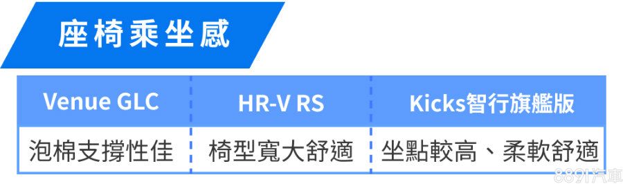 後座方面,HR-V在膝部空間與橫向空間顯著勝出,若是時常有後座坐人、甚至三人滿載的情況,HR-V毫無疑問會是較好的選擇,其他兩部車表現相當,Venue頭部空間略勝、Kicks則在膝部與椅面高度稍佔優勢,空間感受並沒有太大的區別。