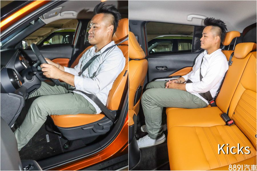 Kicks前座椅型同樣偏寬大,且泡棉表層相當柔軟,如「沙發」一般的形容其來有自,短途移動確實非常舒服,不過一旦開車時間拉長,得頻頻變換坐姿才能減緩支撐較弱的不適感。後座方面乘坐感如同前座一般,給人舒適的第一印象,但膝部空間較小。
