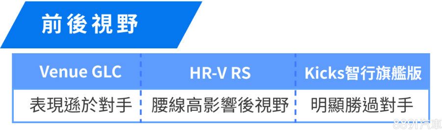 Venue與HR-V前後視野表現相近,以五門車體來說都不算視野太差的數據,相比之下Kicks由於駕駛坐點顯著較高,視野表現硬是好上不少,對於前後車距的掌握將更為輕鬆。