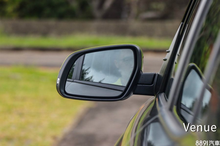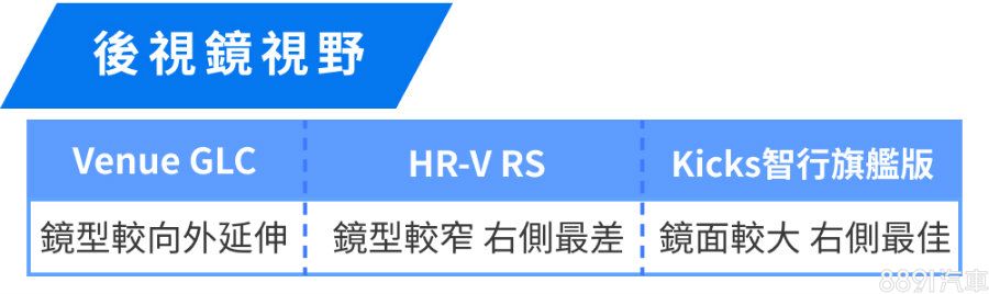 Venue後視鏡造型偏狹長,對於照射「廣度」有著明顯幫助,掌握後方左右車流更為輕鬆。HR-V則在右後視鏡角度略小,實際上路影響不大,稍加轉頭注意來車即可,至於Kicks則是少見右後視鏡角度大於左側的情況,對於左方來車的掌握度較差,好在Kicks配有盲點偵測,稍稍彌補這項小缺點。