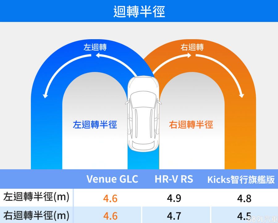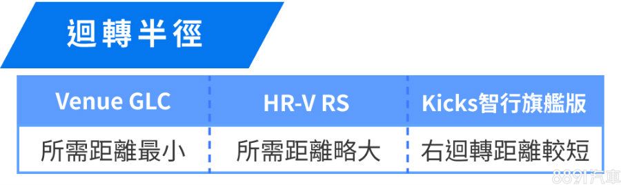 Venue擁有三車中最短的軸距,實測迴轉半徑最短也是合情合理,巷弄穿梭最靈活。至於HR-V與 Kicks實測數據在伯仲之間,實際上路感受也沒有太大差異,都是還算小巧的身形。