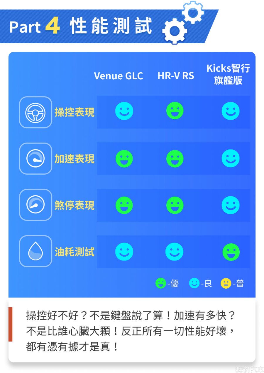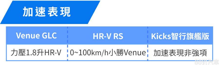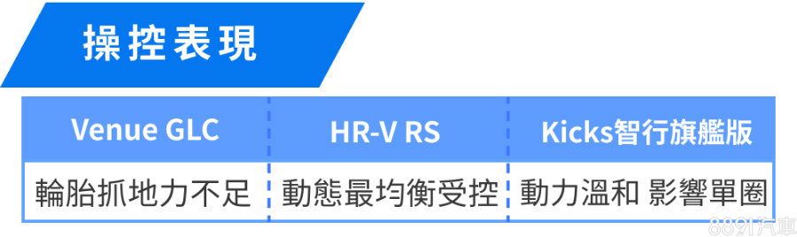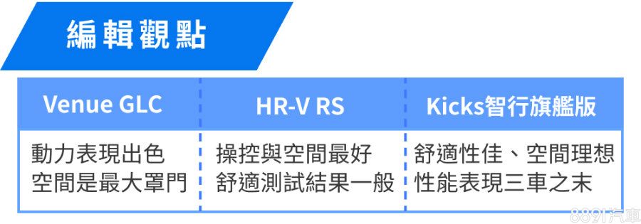 Venue的動力數據和Kicks相當,但實際反應更輕快,甚至加速實測成績與HR-V幾乎平手,可見透過良好的調教,也不會輸給輸出更大的對手,算是這台車在本次測試最大亮點。HR-V主要贏在賽道與空間,底盤在一般行駛情況沒有特別之處,不過換到體現操控的賽道上,便突顯出均衡的協調性,受控程度是三車最高,進而奪下最速寶座,另外是本車向來優勢的空間,再次同場比較依然經得起考驗。最後是熱銷的Kicks,空間稍弱於HR-V,但舒適表現有明顯的領先幅度,底盤吸震性與隔音水準都最棒,取勝項目剛好切中此級距客群重視的環節,受歡迎不是沒有原因。