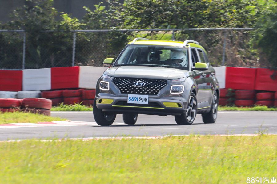不過Venue真正讓人印象深刻的是,CVT變速箱傳輸效率似乎相當好,2檔出彎時,前輪空轉程度有點明顯,超乎123hp/15.7kgm動力的表現,讓人有「想換上更好的輪胎,挑戰更快單圈」的感受;另外需要提出的是,我們試著D檔、手排模式交錯測試,發現D檔在最後一個彎,全力加速出彎又逢2升3檔時,換檔頓挫頗大,大到會影響車身動態,用手排模式就順暢多了,最後Venue測得最佳單圈時間為49.1秒,表現為三車居中。