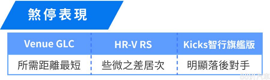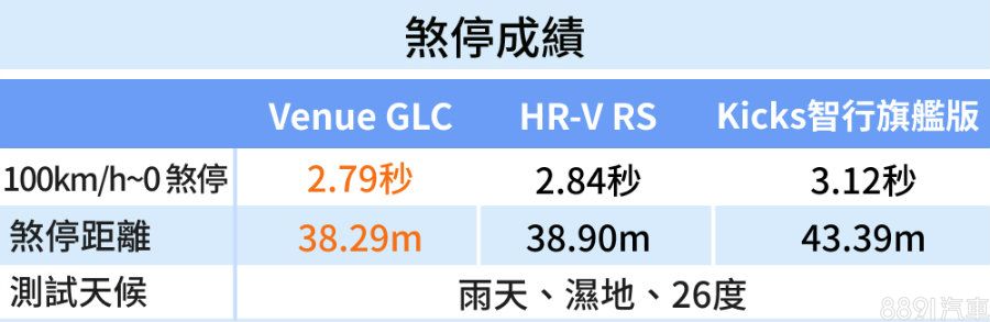 煞停測試當天為雨天,煞停距離受濕地影響理論上會延長不少,但Venue與HR-V仍然繳出低於39m的煞停距離,在輪胎與煞車規格皆不高檔的前提下,如此表現算是相當出色。至於Kicks雖然採用與Venue相同尺碼/規格的配胎,車重比Venue稍微輕了40kg,但煞停距離還是來到43.39m,煞車能力明顯不如另外兩位對手。
