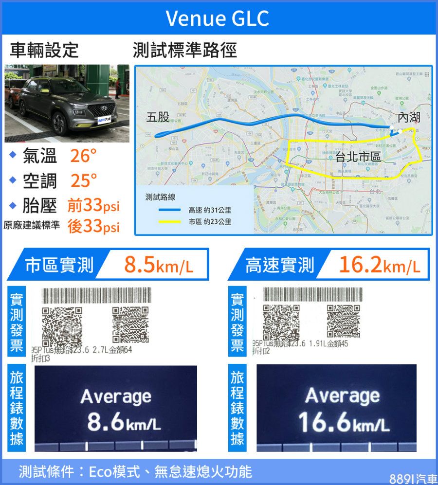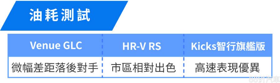 三車都未配有怠速熄火功能,但Venue與HR-V都提供節能模式,透過和緩動力輸出來提升油耗表現,雖然排氣量各異、但市區實測油耗卻沒有太大的區別,反倒HR-V在市區憑藉著大排量、低速輕推便能跟上車流,因此達到9km/L的成績小勝對手。至於高速路段則是Kicks以19km/L勝過對手約16km/L的成績,高速節能更勝一籌。