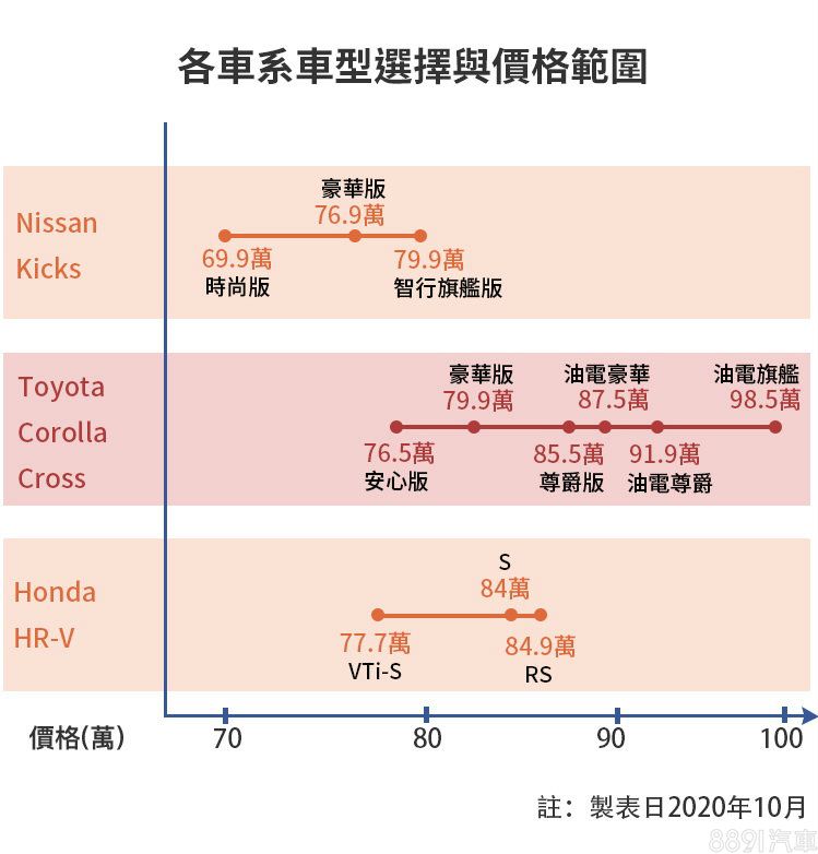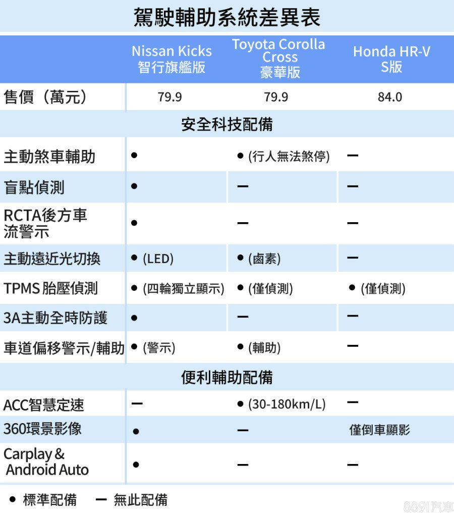 以價格帶分佈來看,Corolla Cross在汽油、油電雙動力加持下,等級分佈從76.5萬~98.5萬都有,光是汽油中階抓著KICKS頂規的價格,價格帶雖然廣,但入手門檻也相對較高。Kicks在三車中明顯有價格優勢,就算直接攻頂也只要79.9萬元,論配備也比對手中階車款豐富許多,在C/P值表現上最為優異。