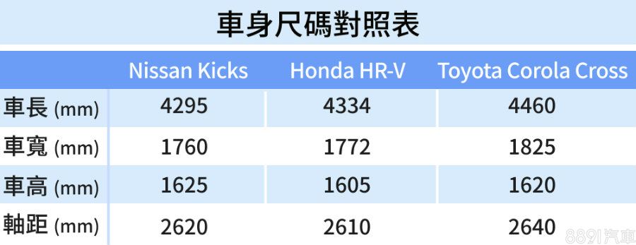 Kicks不論車長、寬都是三者最緊湊者,Toyota Corola Cross車格則明顯大上一號,但卻沒有反應在代表內部空間的軸距指標中,而Kicks擁有的是靈巧好操控的小巧車格,開起來相對沒壓力,新手司機其實也好上路,5.1m的迴轉半徑表現更是在擁擠的都會中穿梭更游刃有餘,相信就算是新手上路,Kicks都會是很容易上手的跨界小休旅!
