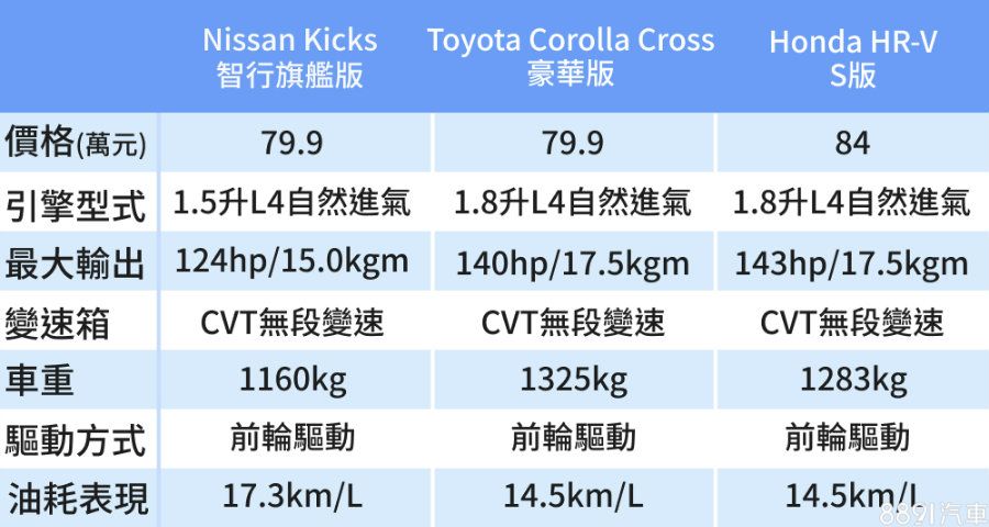 針對跨界休旅最熱三款車型進行比較,抓出各主力等級,分別為KICKS 智行旗艦版(79.9萬)、HR-V 1.8S (84萬)、Corolla Cross 豪華版(79.9萬),看看誰才是C/P最高的跨界休旅車!
