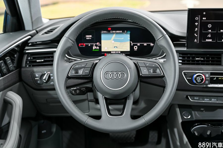 小改款A4所有等級皆配置三幅式跑車方向盤、換檔撥片,按鍵編排簡單易懂,左邊快捷鍵可控制數位儀錶選單,按下「View」則可將中央資訊幕放大,想進入全螢幕導航按此即可;右邊能控制音響系統與免持通話功能。以方向盤握感來說不像BMW那般粗壯,也沒採用平底設計,但兩側人體工學出色,仍可帶來優異的握持手感。
