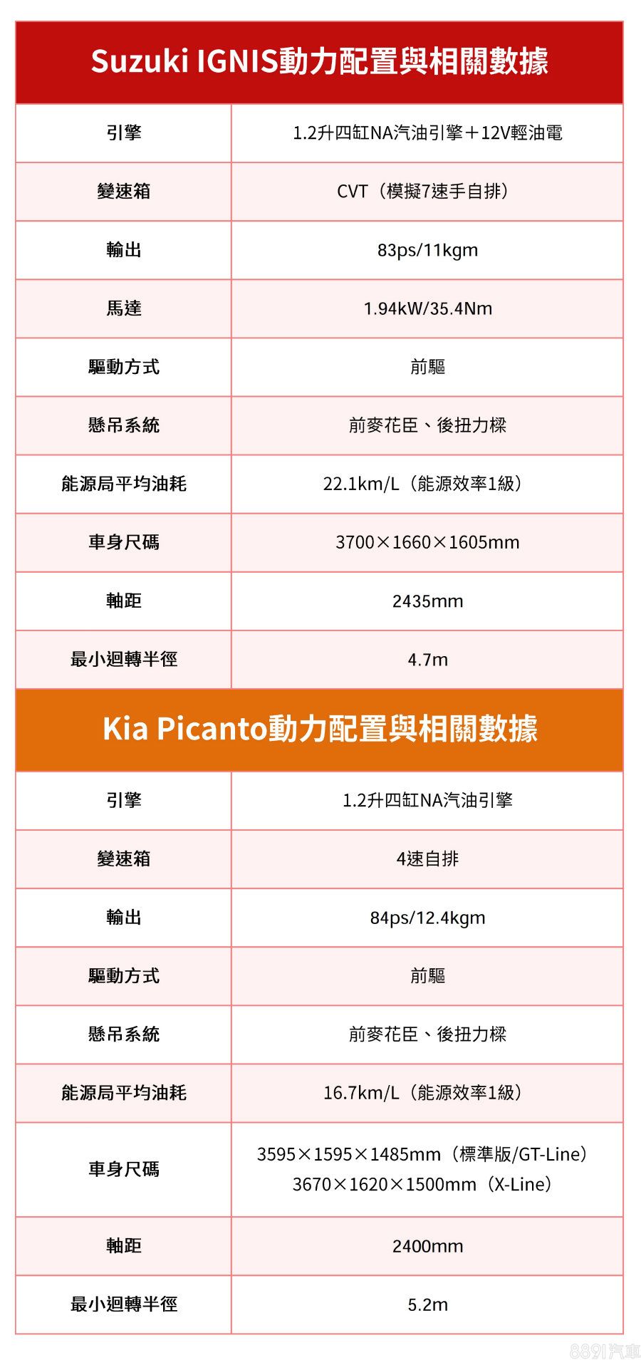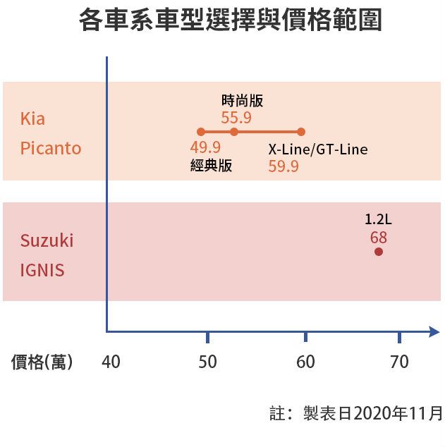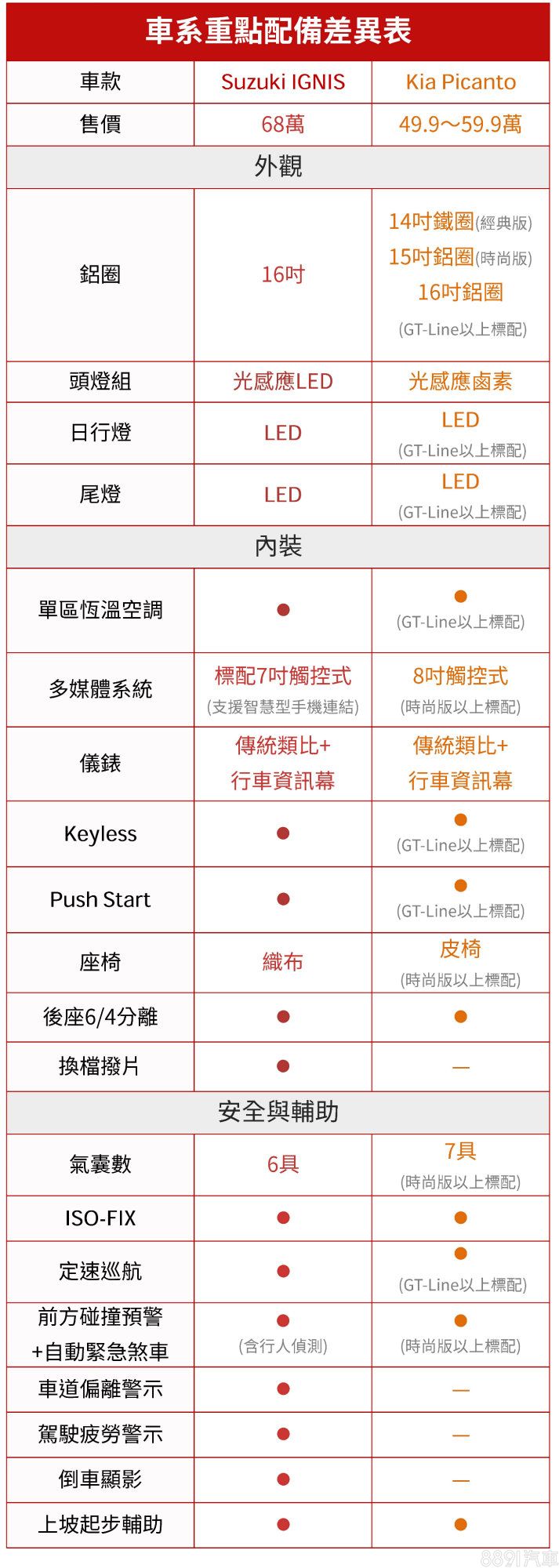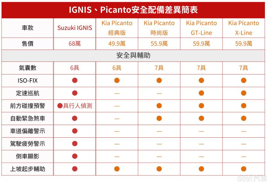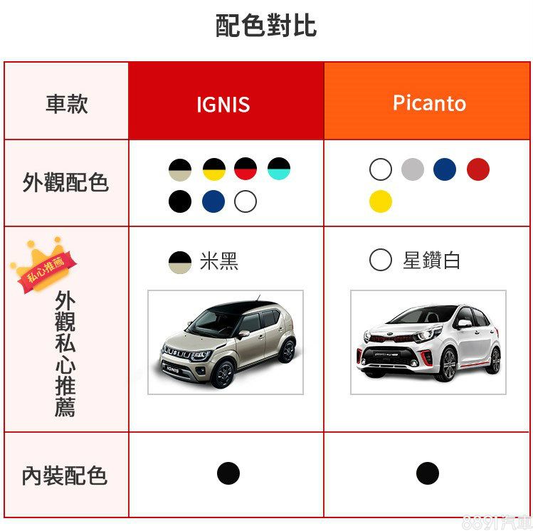 「日本原裝進口」的IGNIS,小改款後維持單一車型,動力改為輕油電,雖然引擎排氣量仍是1.2升,但實際排氣量從1242c.c.,降為1197c.c.,讓稅率因此下修一級,每年從11920元變成8640元,此外,主動安全加入DCBS煞車輔助系統,就連以往需加價的多媒體觸控螢幕也列標配,售價雖較改款前小漲2.2萬元,但都算可接受的合理範圍;Picanto國內規劃單一動力、四車型,售價區間自49.9~59.9萬,最入門的經典版配備「陽春」,主力落在時尚版以上,也是從這個等級起才開始配置主打的「AEB」,往上另設有GT-Line與X-Line等個性化車型。