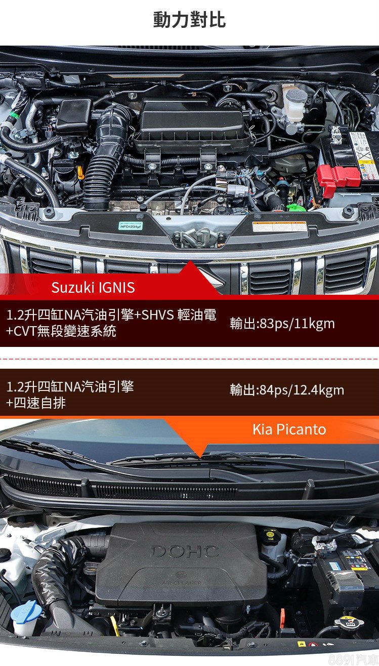 兩款車都僅有單一動力編成,IGNIS小改後導入輕油電系統,原本1.2升四缸NA引擎也稍降排氣量,出力雖從原本的91ps/6,000rpm下修至83ps/6,000rpm,但新增的油電系統可額外提供3.1hp/5.1kgm推力,搭配可模擬7速的CVT無段變速系統,並配有換檔撥片,操控自主性比對手更高。