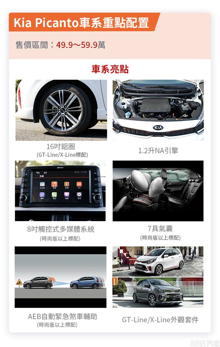 Picanto雖然提供多達4個車型,但諸多實用配備都要到GT/X-Line等級上才能享有,時尚版以上雖增列8吋多媒體觸控螢幕,但並不支援智慧型手機連接,稍嫌可惜。車系主打的「AEB」列為時尚版以上標配,不過功能僅算「陽春」,並沒有與時俱進追加行人偵測的功能,面對消費者安全意識抬頭,顯然已逐漸不符期待。