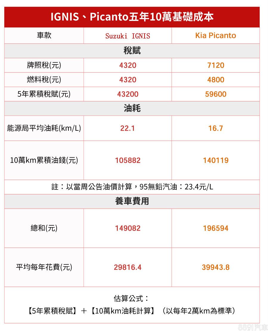 兩者排氣量看似相去不遠,但在台灣「畸形」的稅制下正好差了一階,而這「差一點」的代價讓IGNIS每年可比Picanto省下3280元牌燃稅,能源局油耗數據也是有輕油電科技加持的IGNIS更為優秀,平均下來每年的基礎養車成本可省下萬元之多,這對錙銖必較的小車客群而言應該會相當有感。