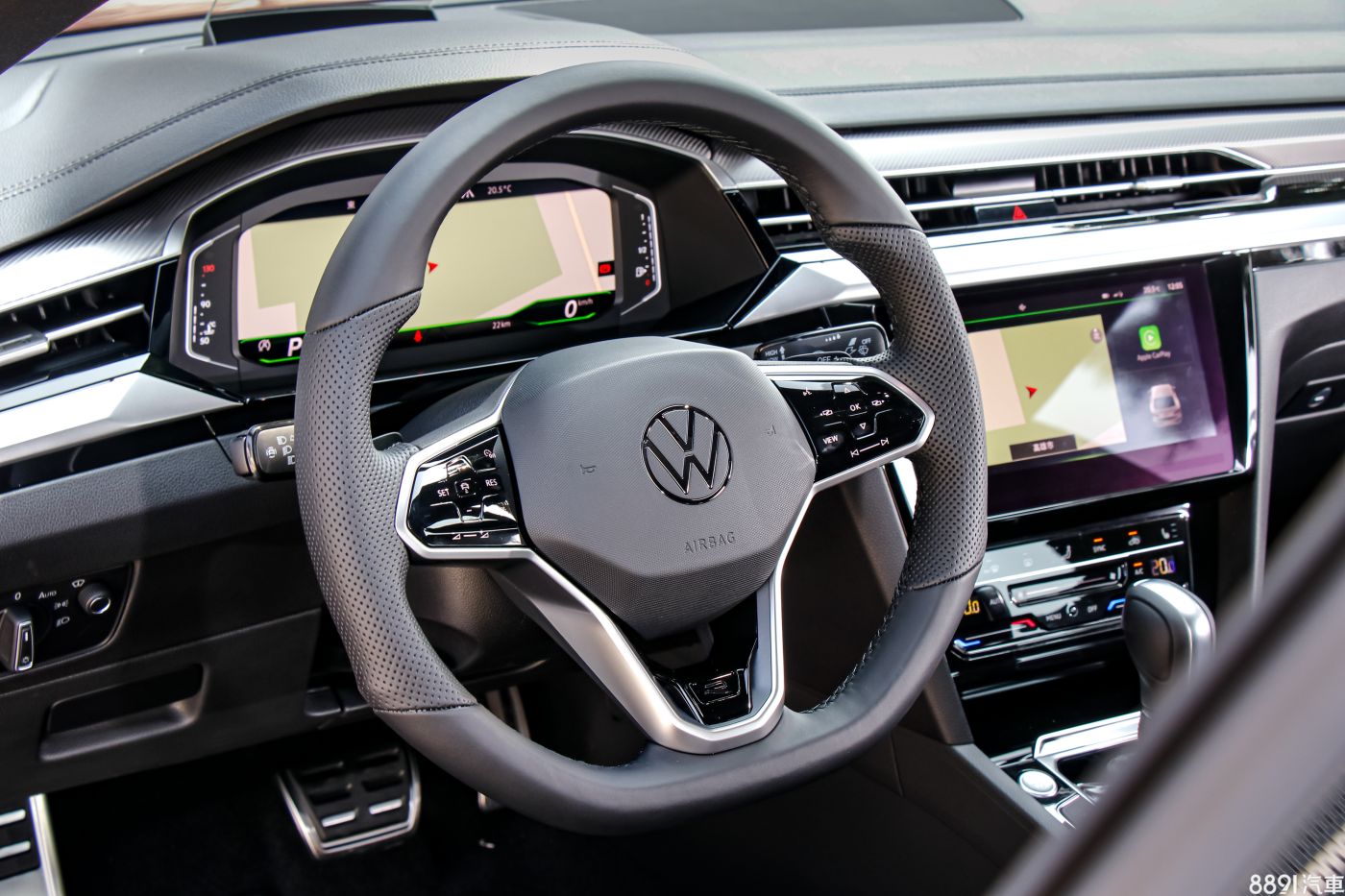 方向盤使用新的品牌Logo,造型和8代Golf類似,但兩側控制介面為觸控設計,操作時會以震動產生按壓的回饋感,整體的用料與造型有達到高級化效果,並提供換檔撥片。