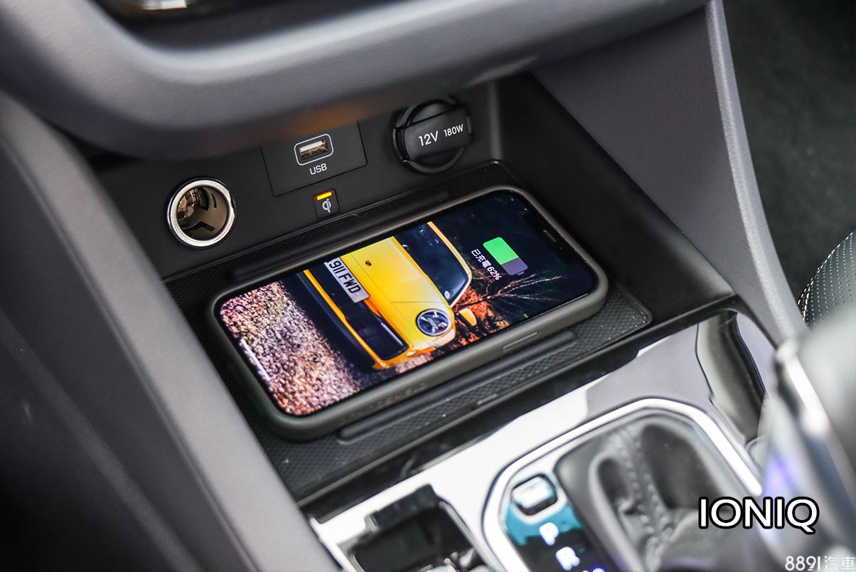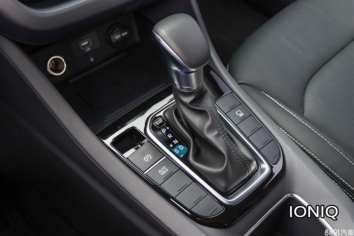 排檔座前方設有無線充電座,深處則設有12V及USB插孔,拿取手機的就手度好,且底部有止滑墊,符合現代人的機能需求 IONIQ Hybrid排檔座設計與Kona Hybrid不同,整合電子手煞車、Auto Hold功能,右邊還可快速進入倒車顯影。