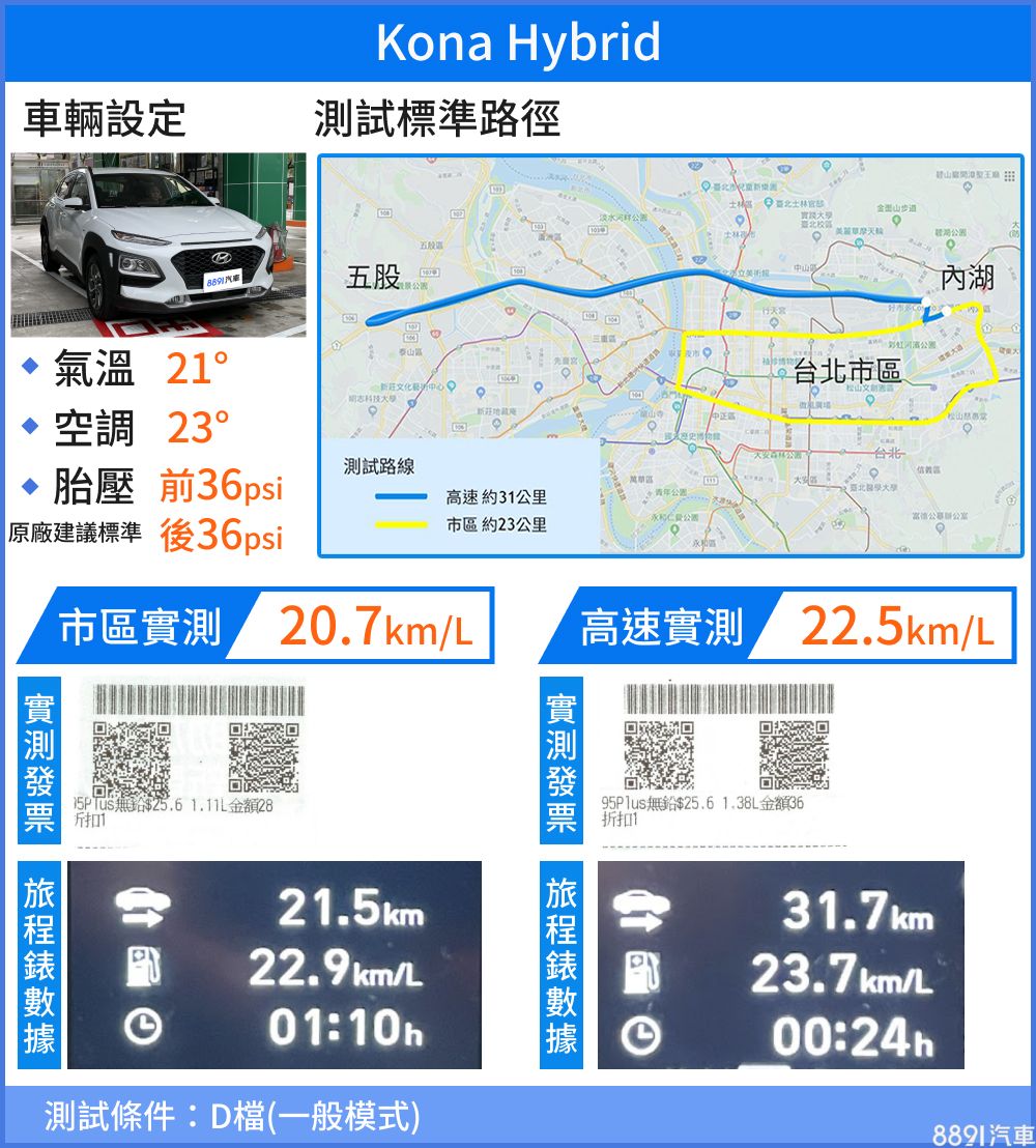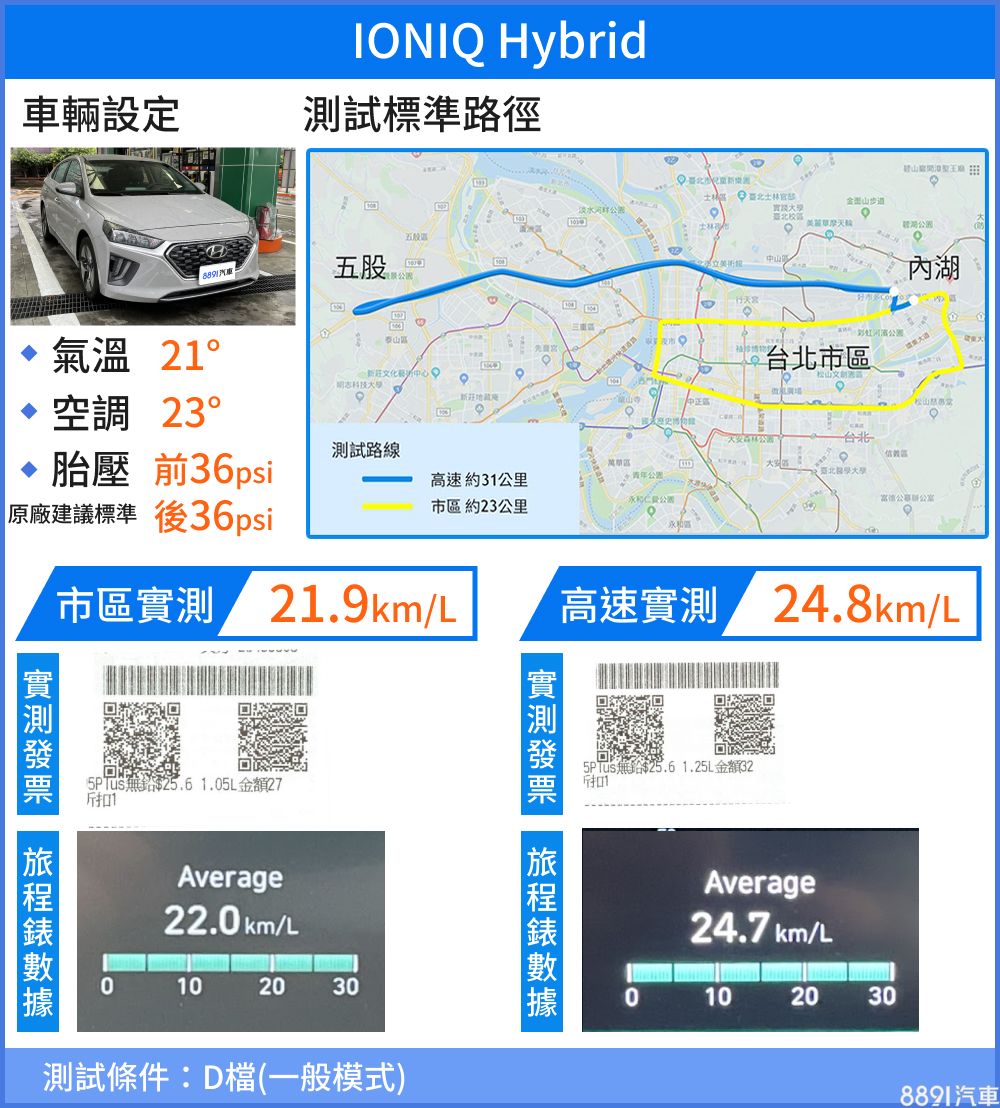 油耗測試流程比照超級測試,市區路段繞行台北市區一週,高速公路則行駛內湖-五股高架路段,沿途車流順暢,幾乎都能維持道路最高速限行駛。由於兩車動力系統完全相同,車重差異也不大,不分市區高速都能輕鬆繳出超過20Km/L的平均油耗表現。其中IONIQ Hybrid在高速路段格外亮眼,實測油耗達到24.8Km/L,顯見IONIQ Hybrid低風阻設計確實帶來更好的長途油耗表現,且純電行駛時速最高可達到120km/h的表現。