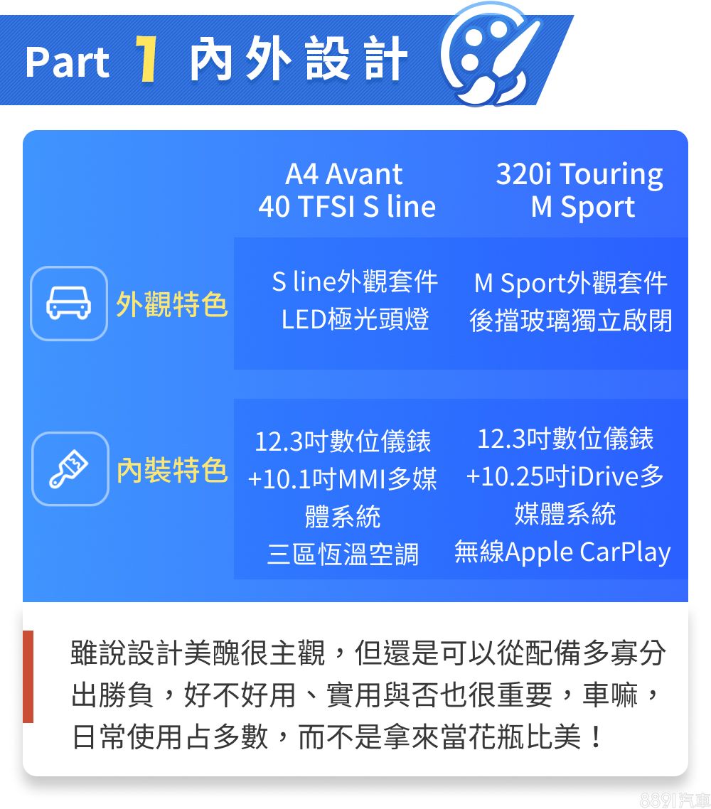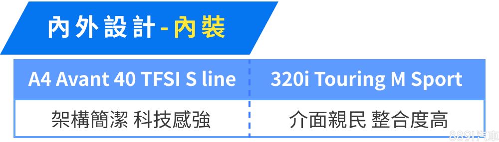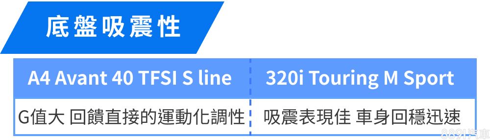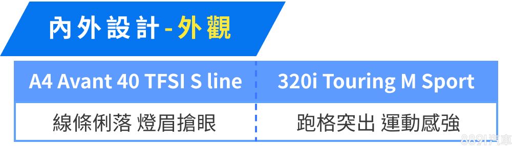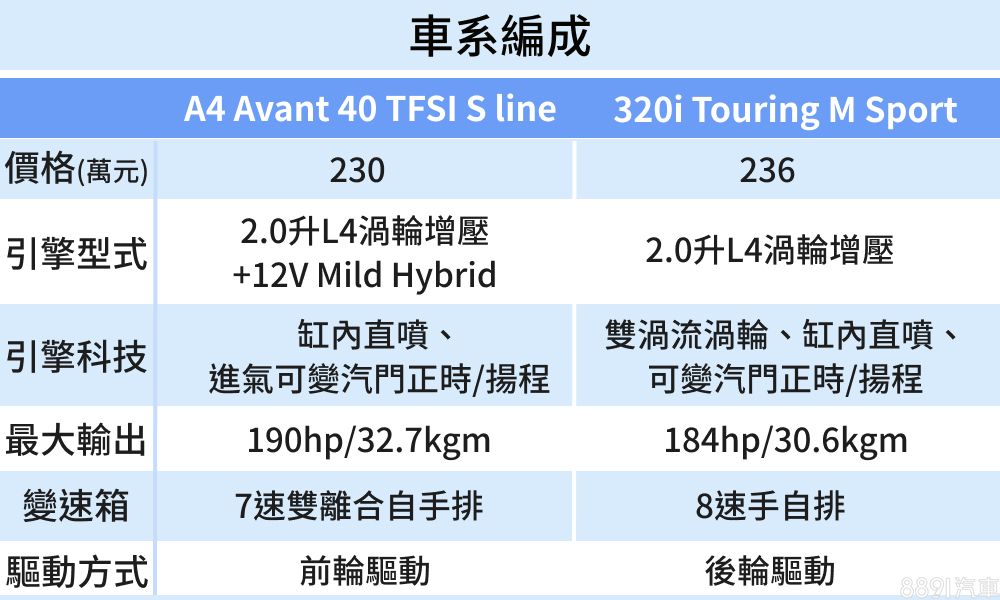 A4 Avant 40 TFSI共有基本款、advanced及S line三種車型,售價分別為216、224及230萬元,動力輸出相近的320i Touring目前則僅有M Sport單一車型,對上價位相近,且同樣搭載運動套件的S line車型倒是門當戶對。不過論及輸出之外的變速箱及驅動方式都有極大差異,且兩品牌的調校特性也不盡相同,都讓這次對決更有看頭!