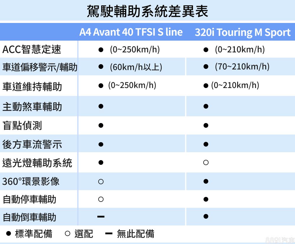 最基本也是消費者最在意的AEB、ACC、車道維持輔助及盲點偵測等,兩車都是完整標配,差異部分在於320i Touring M Sport還將自動停車/倒車輔助及環景影像納入標配清單中,A4 Avant全車系則都需選配(無自動倒車功能);主動遠近光燈切換則是A4 Avant全車系標配,3系列Touring只有最高等級的M340i xDrive才有,其餘車型都得加價選配。