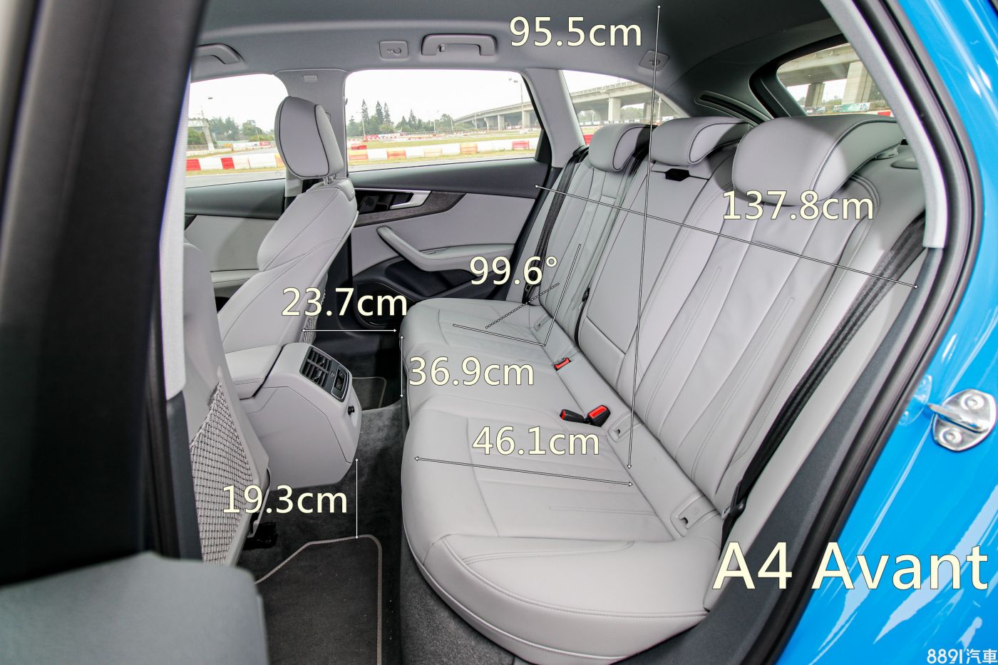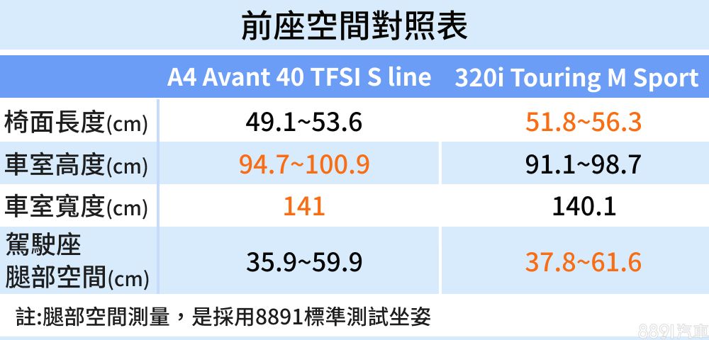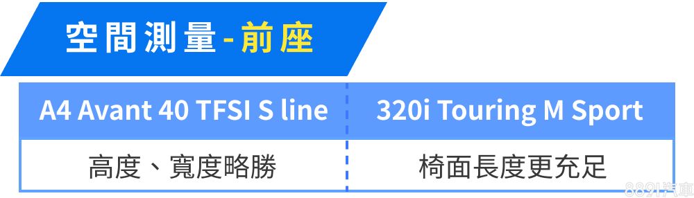 A4 Avant除了軸距之外,其餘車身尺碼皆略大於320i Touring一些,這點也反應在座艙內部丈量數據上,前座橫向及縱向空間都優於對手,不過因數據差距細微,因此實際乘坐於其中,兩者空間感表現相當,倒是這輛A4 Avant因此用淺灰內裝,帶來較開闊的視覺感受。