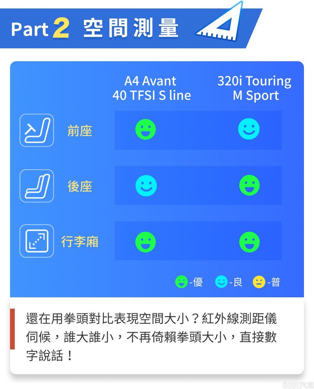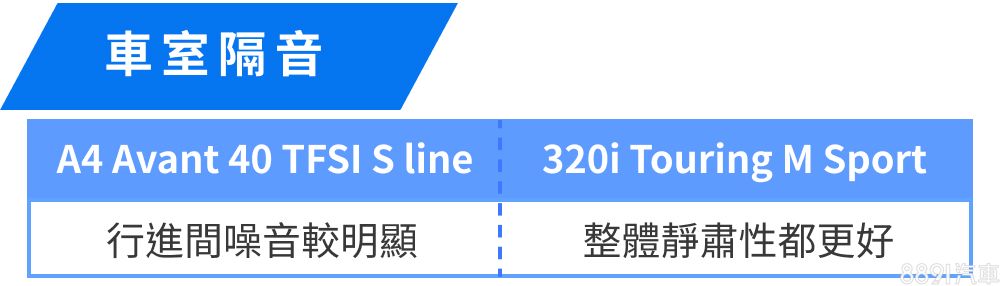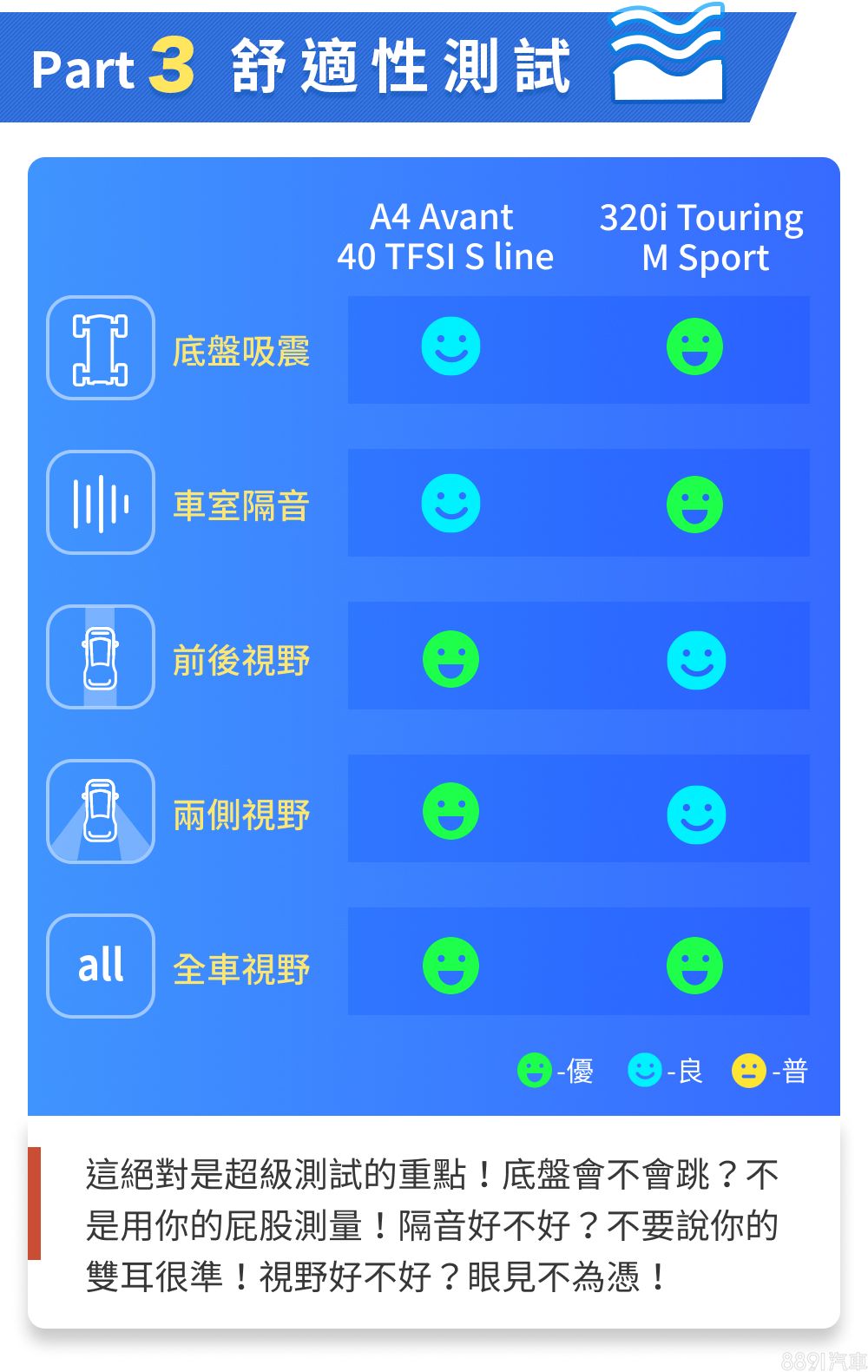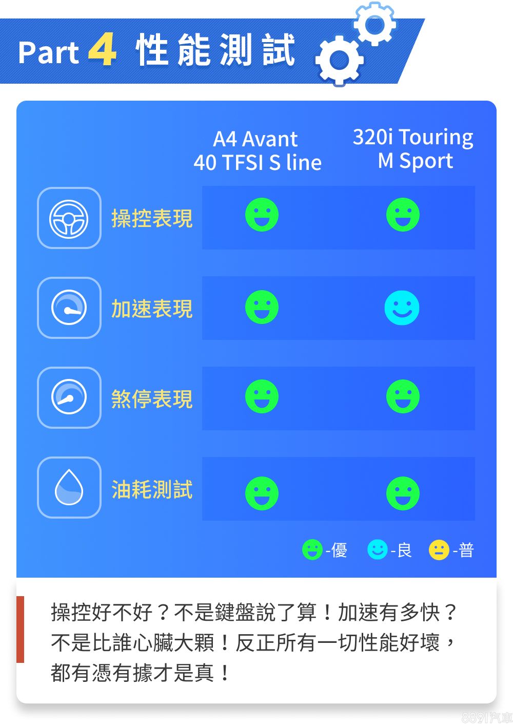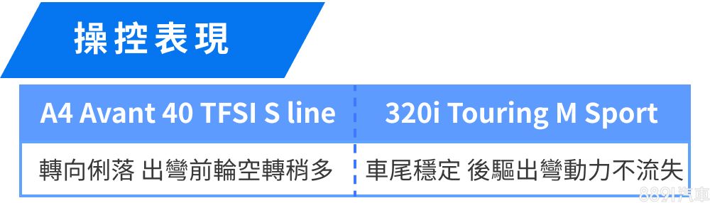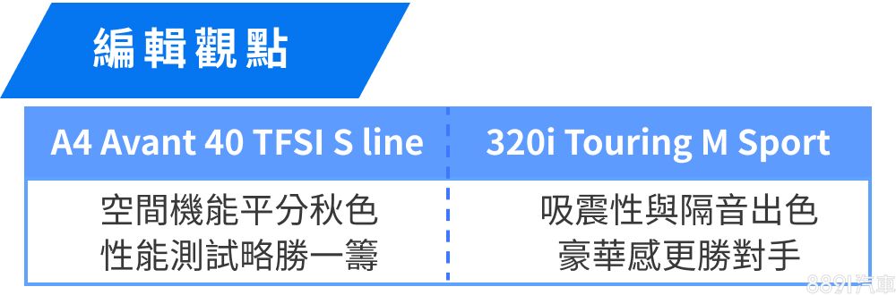 超級測試只看數據!空間方面A4 Avant與320i Touring各自有其優勢,整體數據表現算是平起平坐,動態部分A4 Avant 40 TFSI雖然僅採前驅設定,但馬力略大與高傳輸效率依然在加速測試贏過320i Touring,甚至有些意外的、在賽道成績也以0.3秒差距勝過以運動性著稱的同場對手。這讓A4 Avant小改款的各項進化面對新世代320i Touring也頗具競爭力。