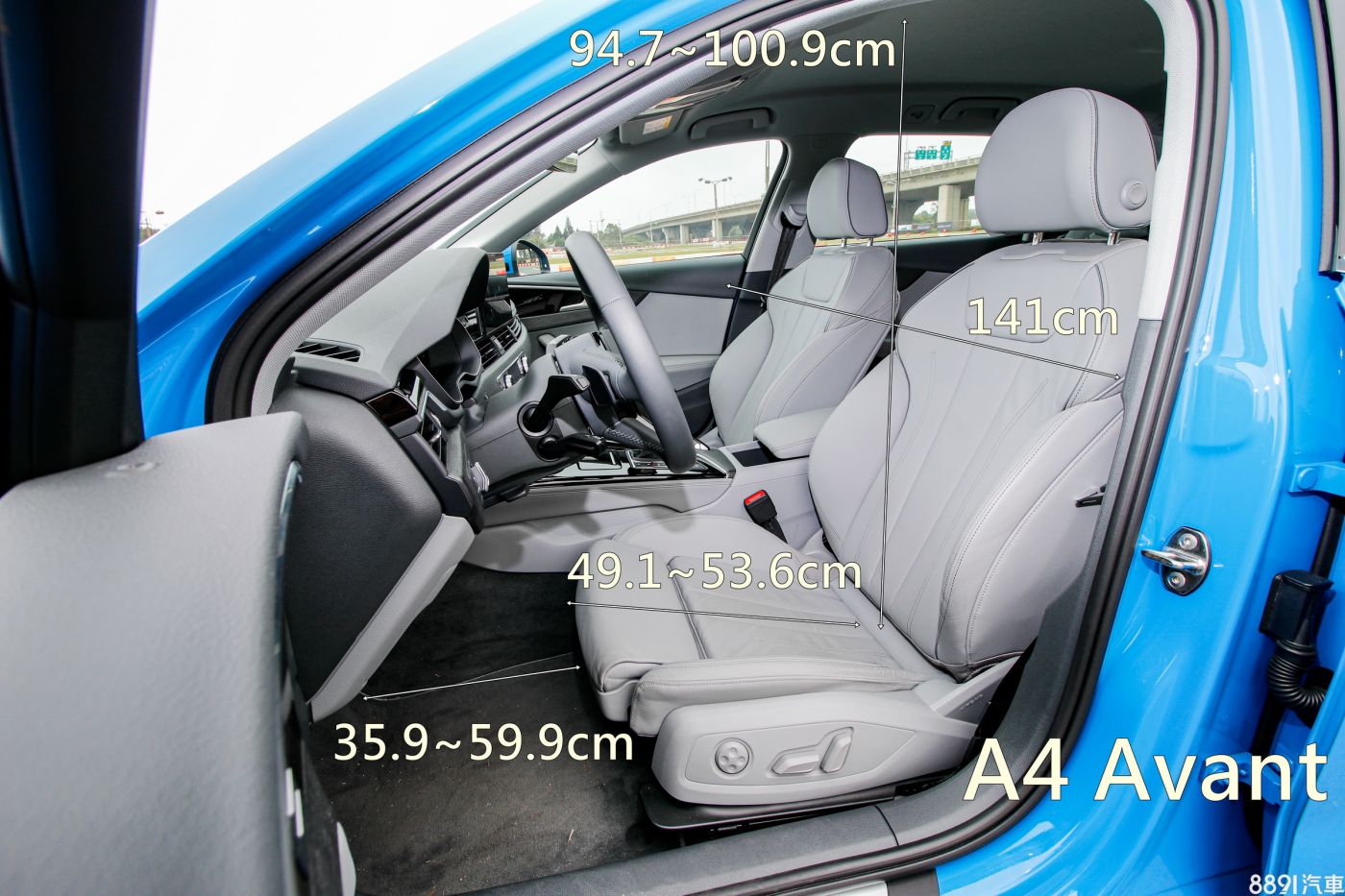 A4 Avant的座椅看起來相當厚實,雙前座皆可電動調整及具備電動腰靠功能,泡棉軟硬適中且剪裁立體,包覆性不錯;前端另可將腿靠手動延伸,強化大腿支撐性,但不論延伸前後的椅面長度都略輸給對手一些,效果稍稍打了折扣。