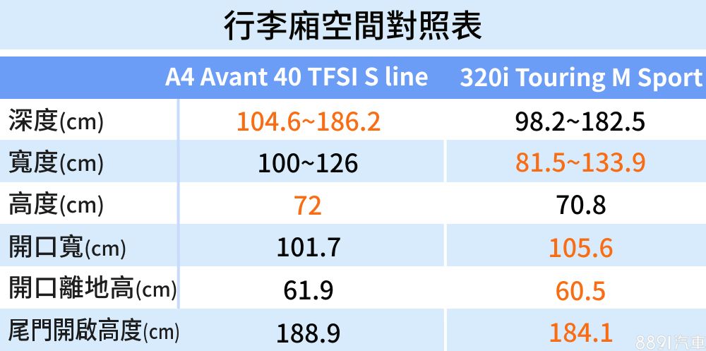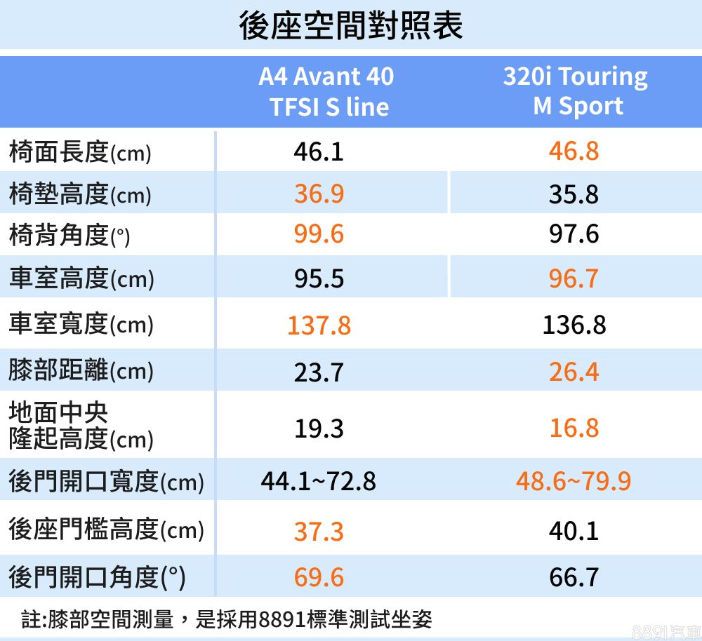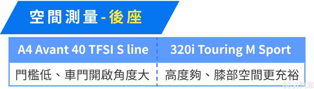 後座開口數據兩車各有優勢,A4 Avant贏在門檻高度低且車門開啟角度大,320i Touring則是擁有較寬裕的開門寬度,實際進出皆未有任何不便之處。