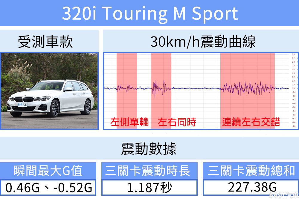 這輛320i Touring雖然也搭載M Sport套件,但卻採用標準懸吊、M Sport懸吊在原廠規畫中屬「0元」選配項目,讓車主能自由依照用車需求選擇懸吊設定。標準懸吊設定下,320i Touring 通過30km/h測試瞬間最大G值僅0.5G上下,震動時長也不到1.2秒,車身平穩、懸吊回穩迅速,相較A4硬朗、320i Touring則顯然多了分緩衝與柔和。