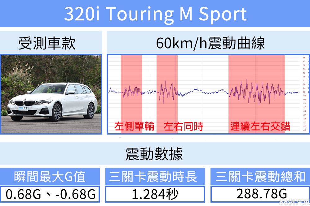 對比30km/h測試的舒適回饋,320i Touring面對60km/h仍是相同調性,最大G值與震動總和均略為增加,以體感來說便是衝擊感略增些許,但仍是舒適、平穩的底盤回饋。