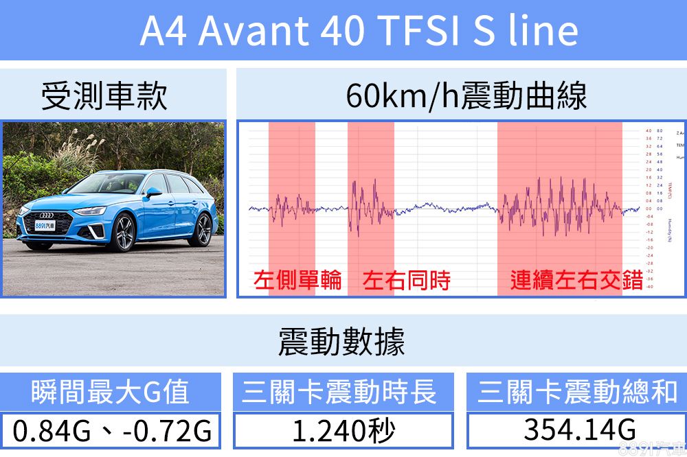 試駕的A4 Avant 40 TFSI S line配有運動化懸吊,與標準懸吊相較車高略低、阻尼硬度也有所提升,從實測數據來看這套懸吊「名符其實」,低速壓過減速丘回饋頗為硬朗,在單輪與左右同時關卡均呈現俐落、明快的車身動態。但在連續左右關卡便有些來不及吸收震盪,進而產生過度彈跳的情況,以「原廠」設定來說,這組懸吊還真有幾分性能感。