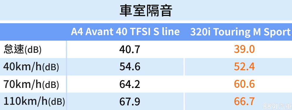 新世代BMW在隔音方面的表現都屬傑出,320i Touring也不例外,不論是停車怠速或行進時各速域間的噪音分貝值都比A4 Avant還要低,對輪拱胎噪及風切聲的抑制相當有一套。