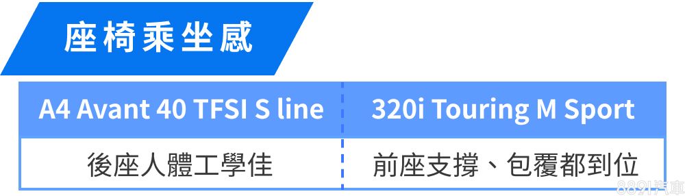 來到後座,較低陷的椅面為320i Touring換得更好的車室高度,且因軸距較長,膝部距離也更多,整體空間感較佳。A4 Avant雖然寬度略勝,但地面中央隆起高度較高,若後座中間要乘載乘客,恐怕會比320i Touring還要來得彆扭。