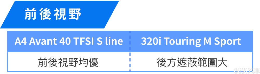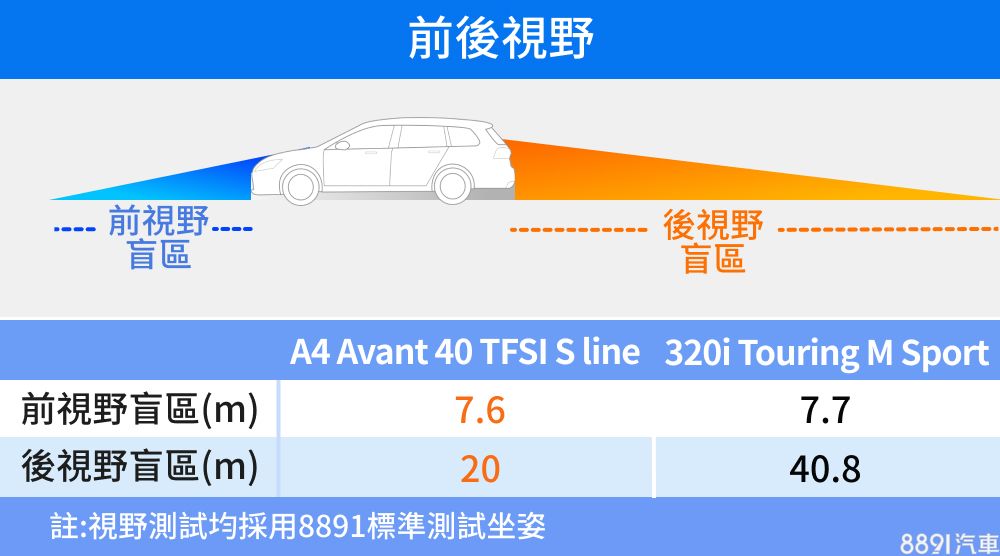 前後視野皆由A4 Avant勝出,特別是後視野部分,320i Touring的後擋遮下緣較高,遮蔽範圍也多一些,加上後座頭枕不像A4 Avant可進一步往下收,使得遮蔽範圍比對手多更多。