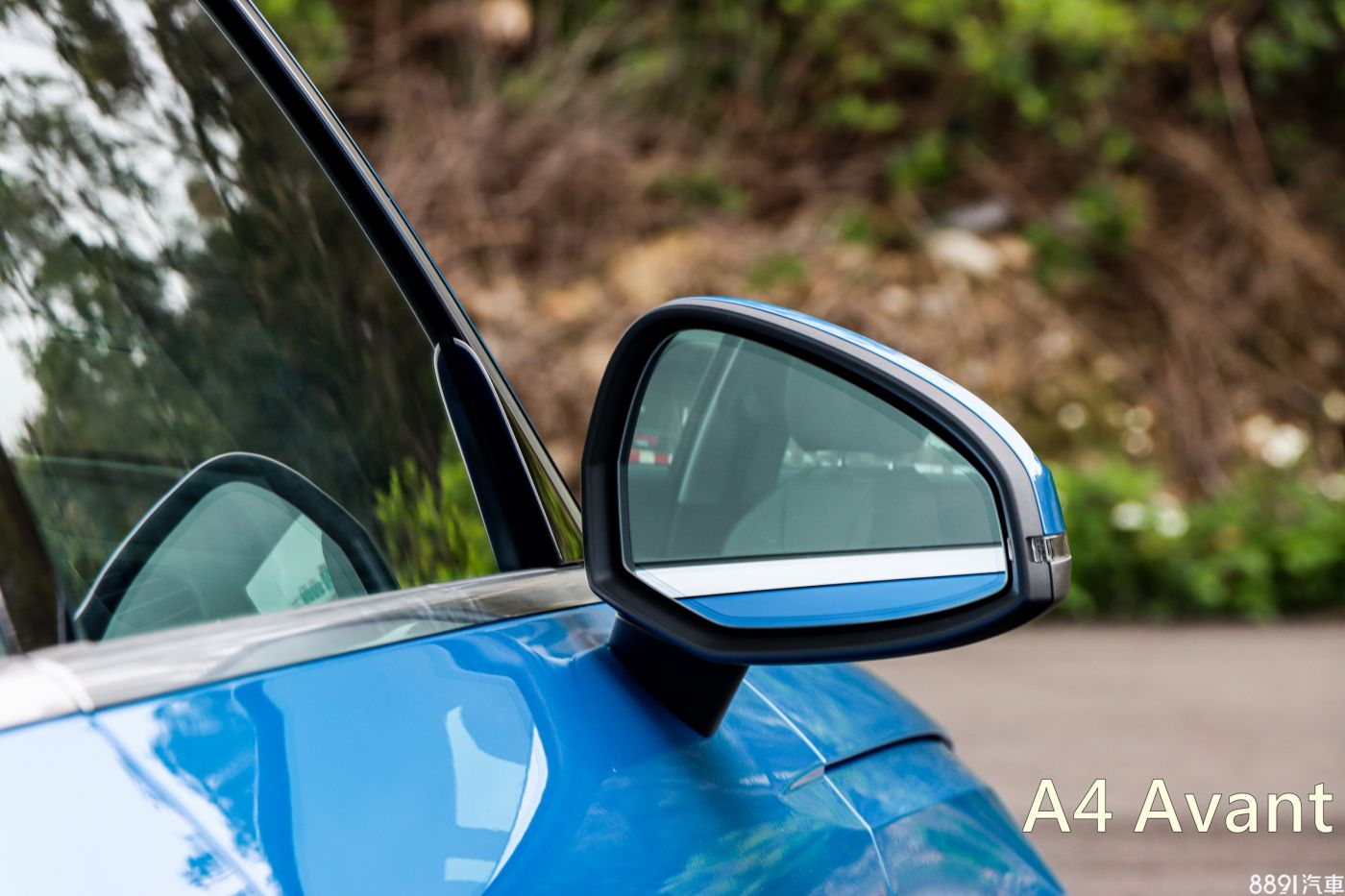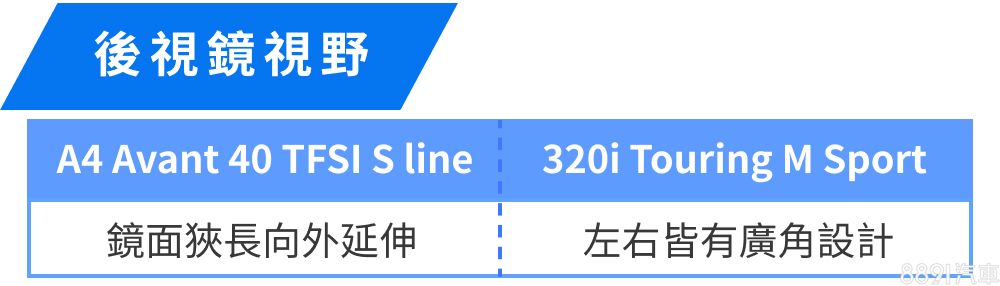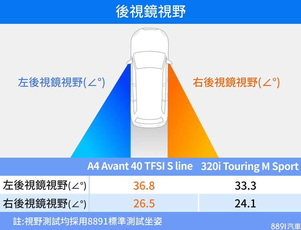 後視鏡視野同樣由A4 Avant取勝,狹長鏡型加上大面積鏡面,以及左側廣角等設計,左右視野都優於兩側皆有廣角設計的320i Touring。