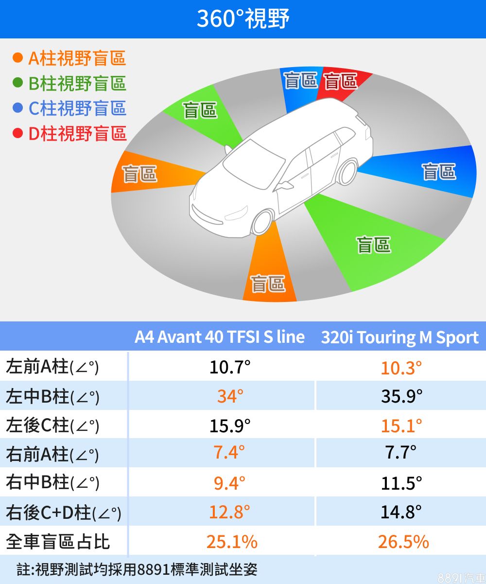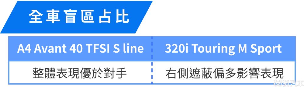 兩車盲區占比差距不大,320i Touring小輸的原因在於右半側遮蔽部分都較對手來得多,不過還可以靠標配的環景影像來判位輔助,A4 Avant則需另外加價選配。