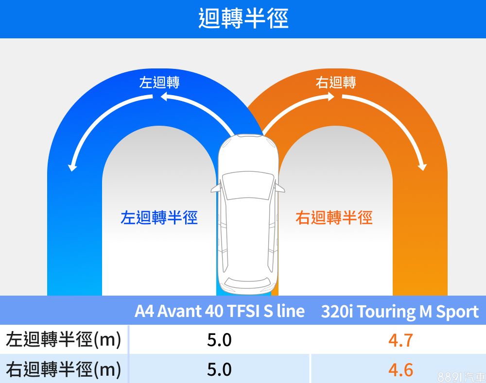 雖然320i Touring的軸距較長,但實測左右迴轉半徑皆比A4 Avant來得小,也都落在5米以內, 遇上窄巷調頭或路口迴轉等狀況會相對輕鬆一些。