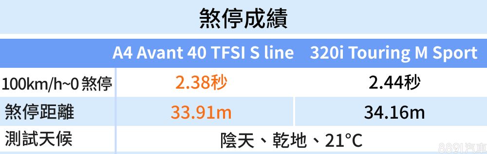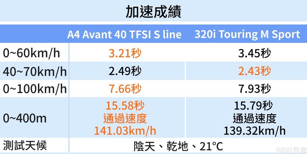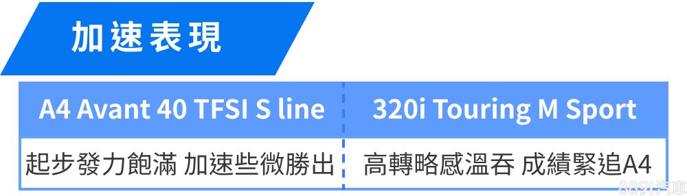 儘管320i Touring加速過程換檔感受激進也多一些運動感,但實際測試成績卻是A4 Avant小幅勝出,仔細分析數據兩者差異雖然不大,但幾次測試下來320i Touring百公里加速成績始終在8秒上下徘徊,而A4卻能輕易進入七秒台,凸顯A4 Avant 40 TFSI確實在馬力與動力銜接性佔有優勢,擊破320i Touring所具有的後驅加速優勢。