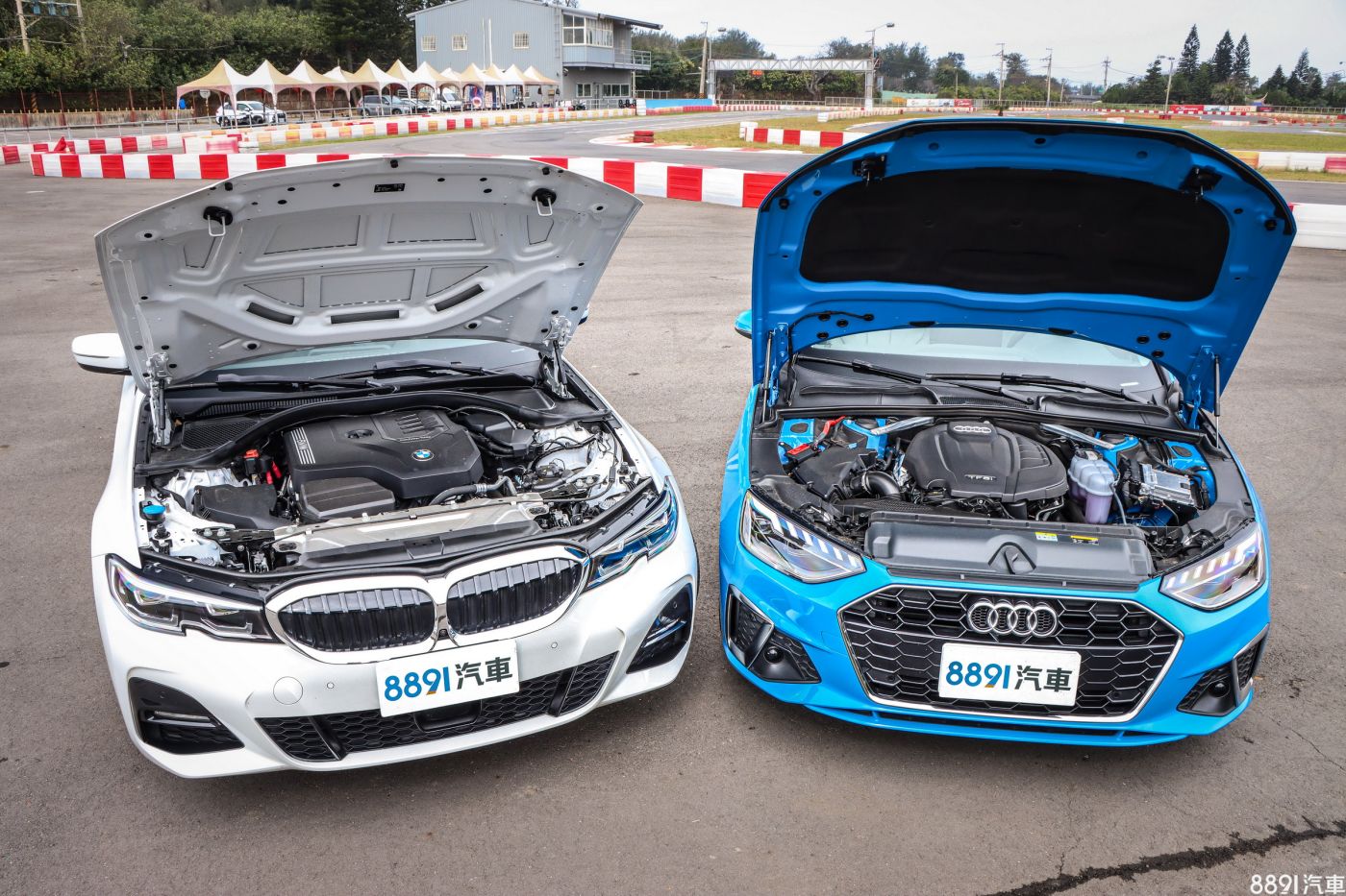 兩車動力系統「門當戶對」,都採用2.0升四缸渦輪汽油引擎,A4 40TFSI最大馬力190hp/4200~6000rpm、峰值扭力32.6kgm/1450~4200rpm,搭配換檔快速的7速雙離合器變速箱;320i則是184hp/5000~6500rpm、30.6kgm/1350~4000rpm,帳面輸出略小一點點,搭配8速手自排變速箱。在燃油引擎之外,A4更加入12V微油電馬達作為動力輔助,然而實質馬達輔助感受微乎其微,真正影響兩車加速表現的關鍵還是在前後驅差異,採後驅設定的320i在全力加速瞬間重心後移、牢牢壓住驅動輪,動力流失較少自然會更有優勢。