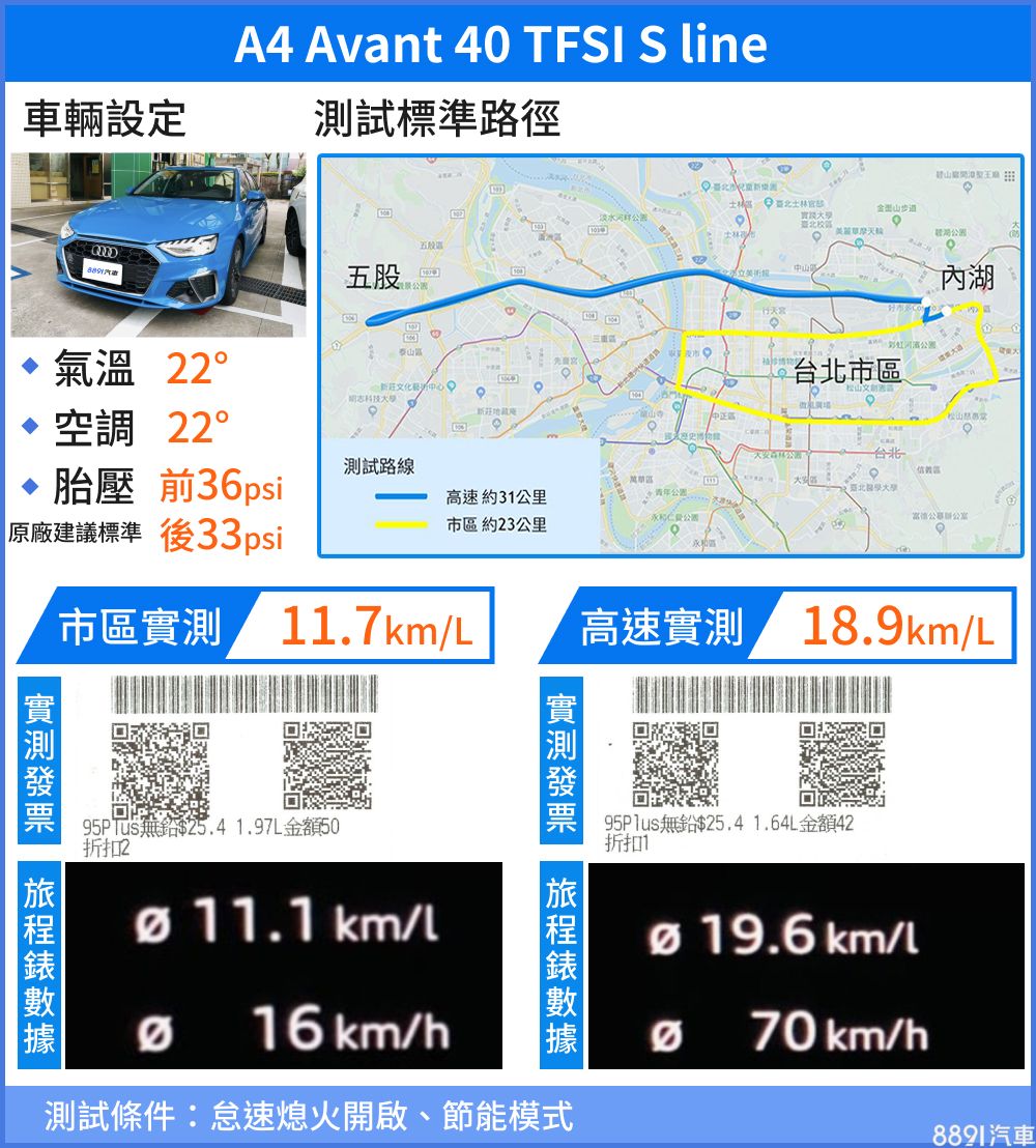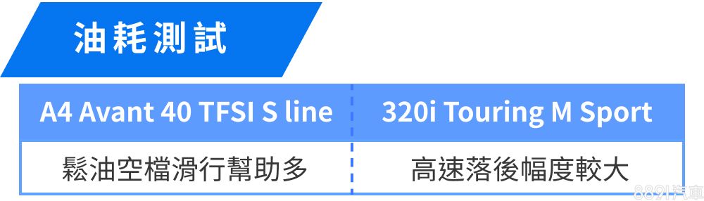 A4 Avant靠著較長的怠速熄火時間以及鬆油門空檔滑行這兩項優勢,不論在市區或高速路段行駛都對節能效果助益良多,顯現出Audi對於12V輕油電技術確實有一套,特別是高速實測與320i Touring可以差到2.2km/L,距離拉長的話差距會更趨明顯。
