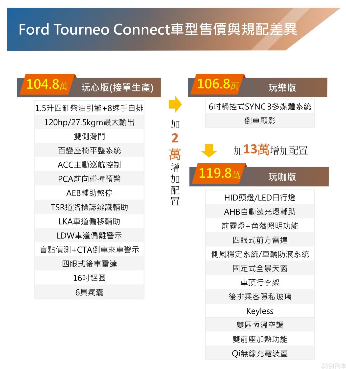 全車系標配Co-Pilot360 Technology系統,ACC沒有全速域,和Ranger相同。入門版本為接單引進,只有2萬價差,基本上會以106.8萬元的玩樂版開始考慮,比起頂規少了舒適與便利配備,確實就比較商用導向,而最貴的玩咖版再多13萬元,就真的提升不少家用成分。
