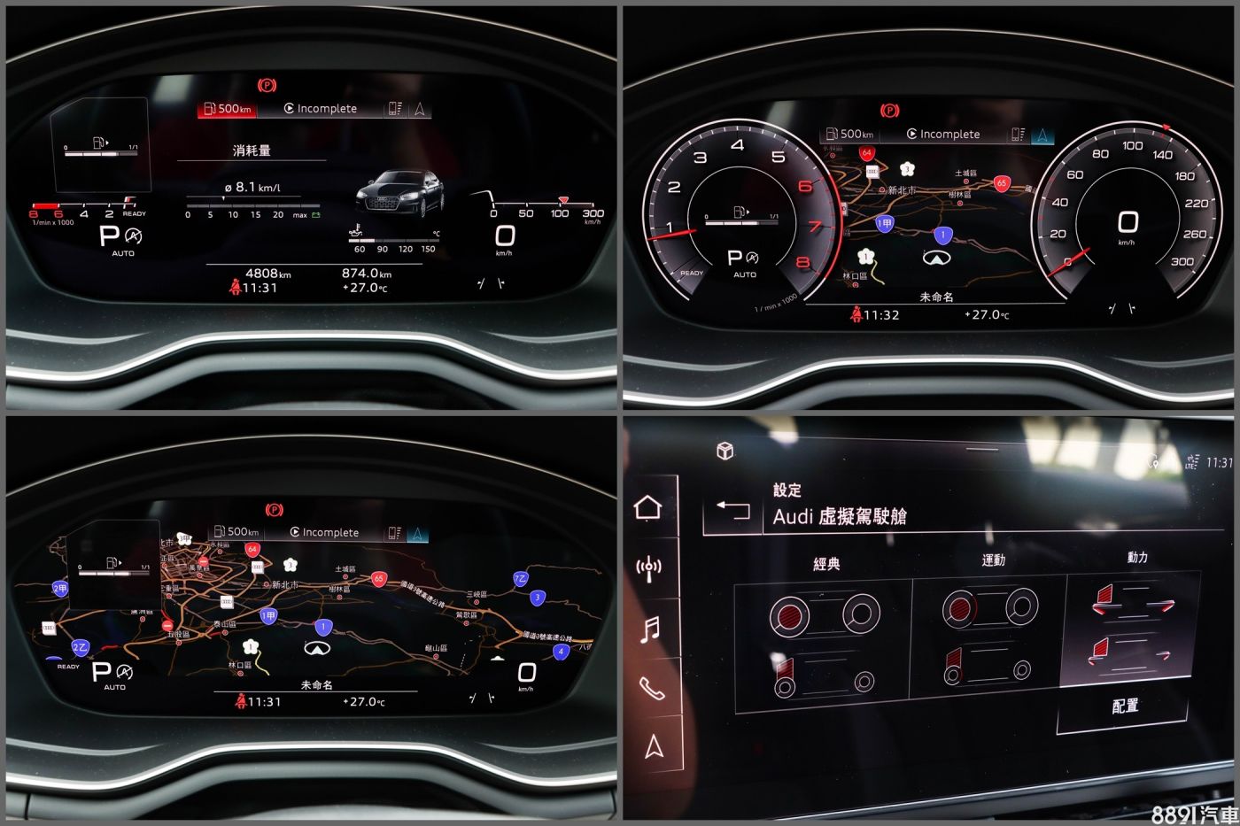 Virtual Cockpit數位儀錶介面是Audi的特色配備之一,新版系統提供多種顯示風格,包含小改後新增的「動力」模式,以直條量表和極簡風格呈現。如同小改前,各模式皆可切換儀錶與資訊畫面之比例,雖說顯示風格可透過中控螢幕設定,但未能隨駕駛模式連動切換。