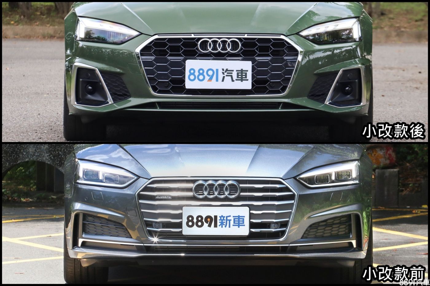 A5小改後水箱罩造型更寬扁,柵頂三道溝槽是Audi新識別,效仿自Sport quattro的經典特徵,全車系標配矩陣式頭燈,具備光感應啟閉及自動遠光輔助等功能,並搭配新款虛線式日行燈。由於試駕車標配S line外觀套件,藉多層次的下擾流前唇造型和立體化梯形飾框強化運動感。
