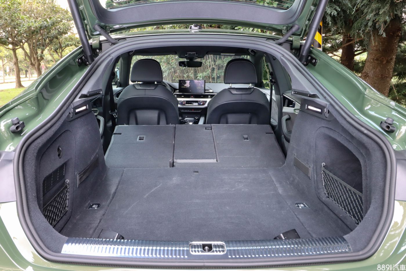A5尾廂相當平整方正,且縱向空間深,兩側並有置物網可搭配使用。由於高度仍被尾門斜度限制,掀背的設計並沒有帶來空間優勢,標準465L的容積表現僅比A4 Sedan多出5L,不過若4/2/4後排完全傾倒,A5將行李廂與後座空間結合後可提供較房車更為靈活的機能性。