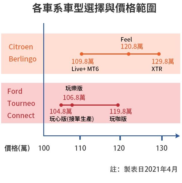 主打商用兼顧家用的「斜槓商旅」,是不少頭家拚事業、顧家庭的首選,消費者在意的除了空間機能、安全配備有沒有到位外,價格與持有成本也是關鍵。向準此一市場,福特於今年3月發表Tourneo Conncet,中文稱作旅玩家,以「同級最便宜」為號召切入七人座商旅市場,而價格帶正好與對手雪鐵龍Berlingo重疊,搶客意圖明顯!