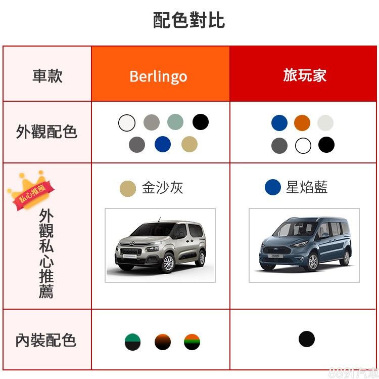 兩車提供的外觀配色算是豐富,雖說仍以主流的灰階色系居多,但也不乏少數個性化的鮮豔色可選,以Berlingo為例,私心推薦金沙灰,能呼應設計感強烈的外型,也不會過於高調,至於旅玩家則建議口味大眾的藍色,搭配其偏向商用的外表也不顯老調。另外,Berlingo依車型還有不同內裝配色,視覺豐富度更勝採單一黑色的旅玩家。