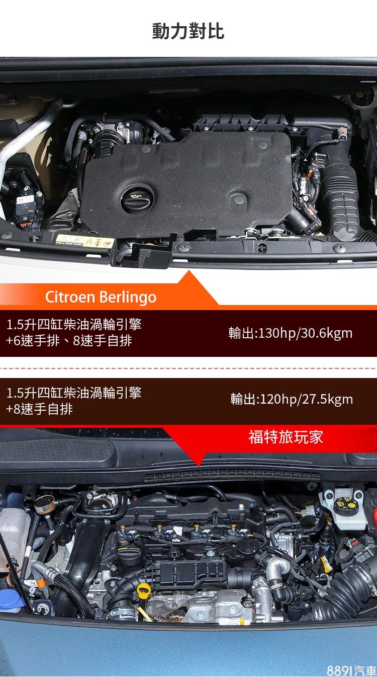 兩車均採單一動力編成,且均為1.5升四缸柴油渦輪引擎,端看帳面數據上是由Berlingo勝出,變速箱配置方面,兩者均搭8速手自排,不過Berlingo配有換檔撥片,操駕自由度更高,另外Berlingo尚有供應6速手排的車型,以較親民的價格鎖定手排愛好者或一般企業用戶。