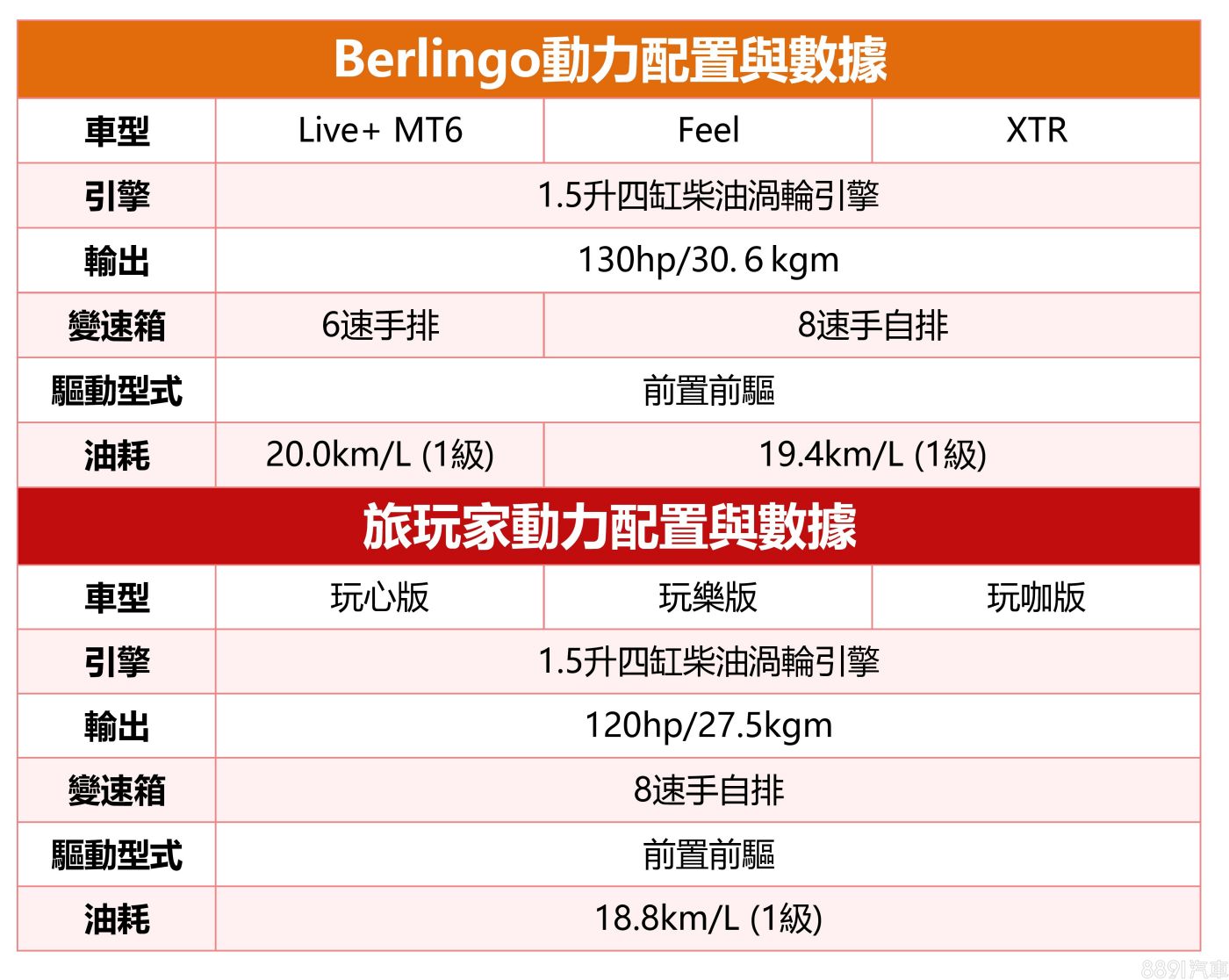 兩車動力配置相當,皆獲能源局1級能源效率,不過Berlingo不僅輸出較高,且無論手排或自排車型,平均油耗皆優於旅玩家的18.8km/L。