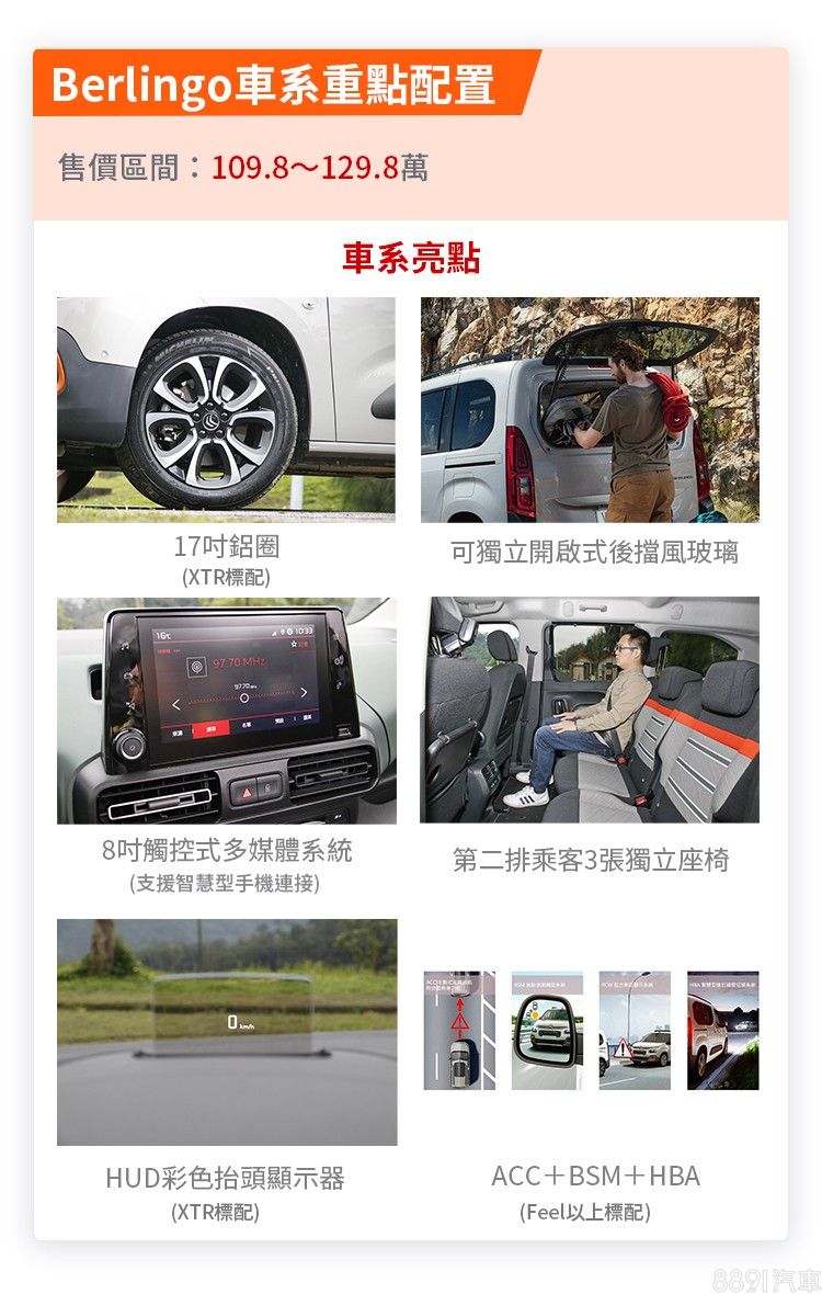 Berlingo全車系標配16吋鋁圈、鹵素頭燈、LED日行燈、雙區恆溫空調、電子式駐煞車、8吋觸控螢幕等配備,駕駛輔助系統將前方碰撞預警煞車、車道維持輔助、交通號誌識別等列為標配,但消費者在意的ACC需到Feel車型以上才有,頂規的XTR升級17吋鋁圈、內外專屬裝飾外,更獨享抬頭顯示器、無線充電板等配備,值得一提的是,全車系標配之可獨立開啟式後擋風玻璃、折疊式副駕駛座、第二排3張獨立座椅等配置,對於置物機能與空間應用也有加分。
